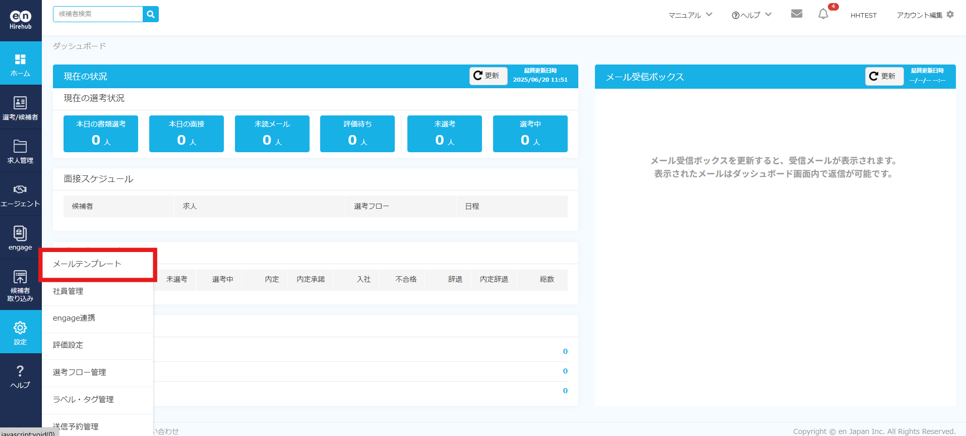 候補者や人材エージェントとのメールのやりとりで利用するメールテンプレートを設定することができます。