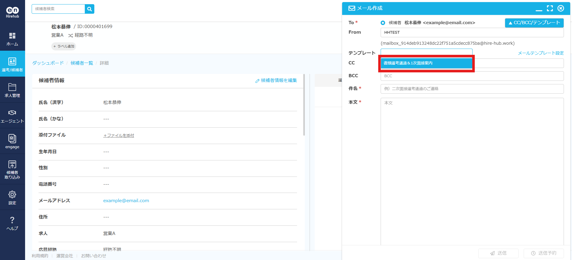 3. 設定後、候補者や人材エージェントへのメール作成時にテンプレートが選択できます。