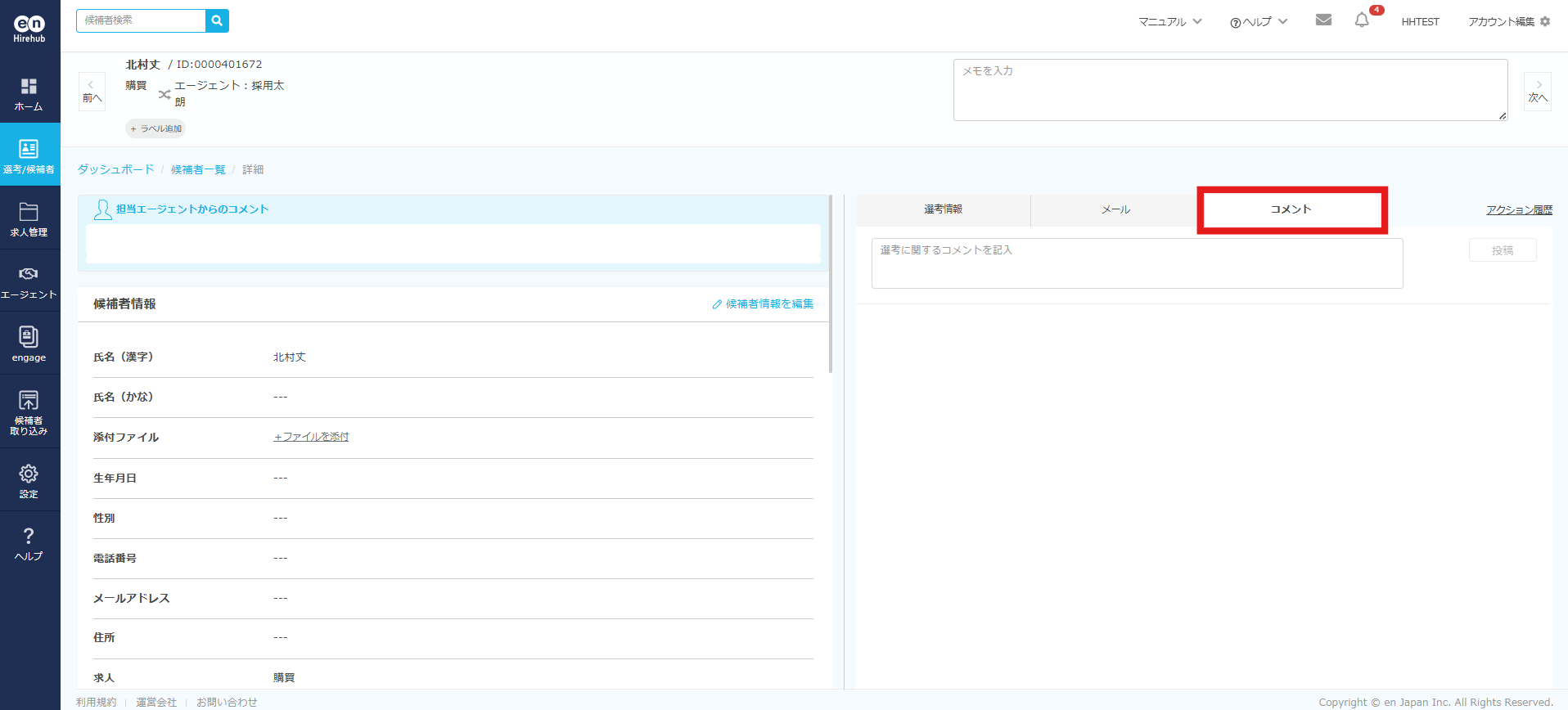 コメントタブより候補者ごとに「コメント」を残すこともできます。