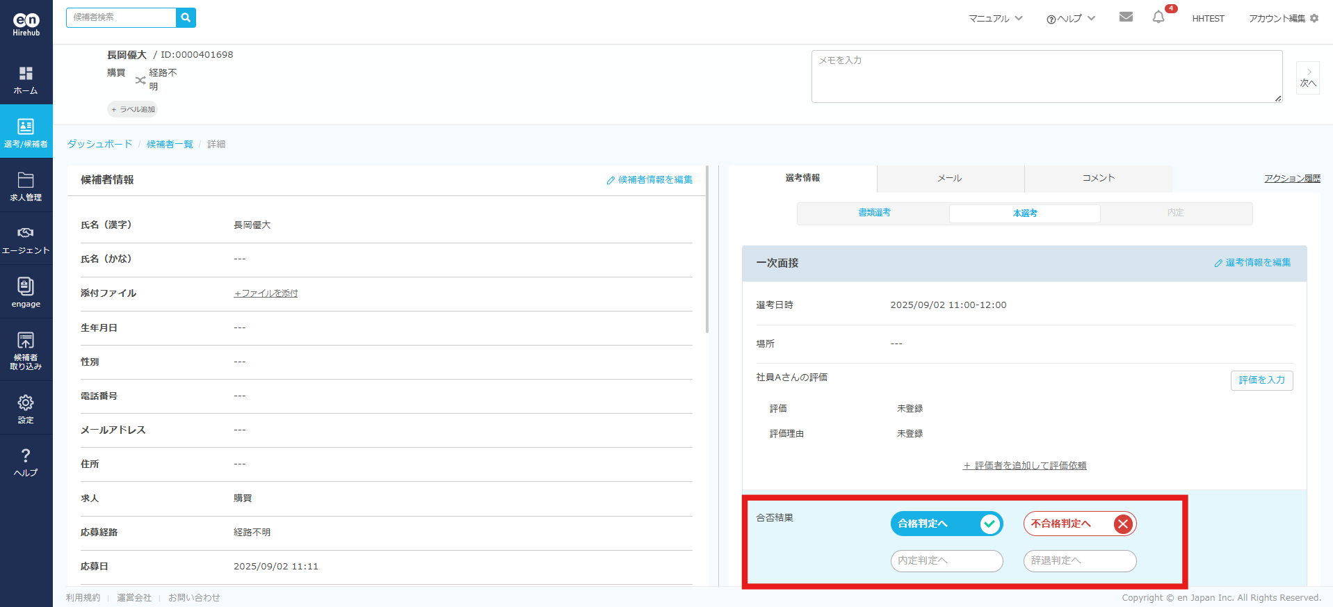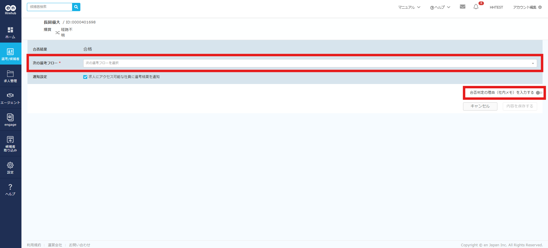 ※「合否判定の理由(社内メモ)を入力するをONにすると、メモを残せます