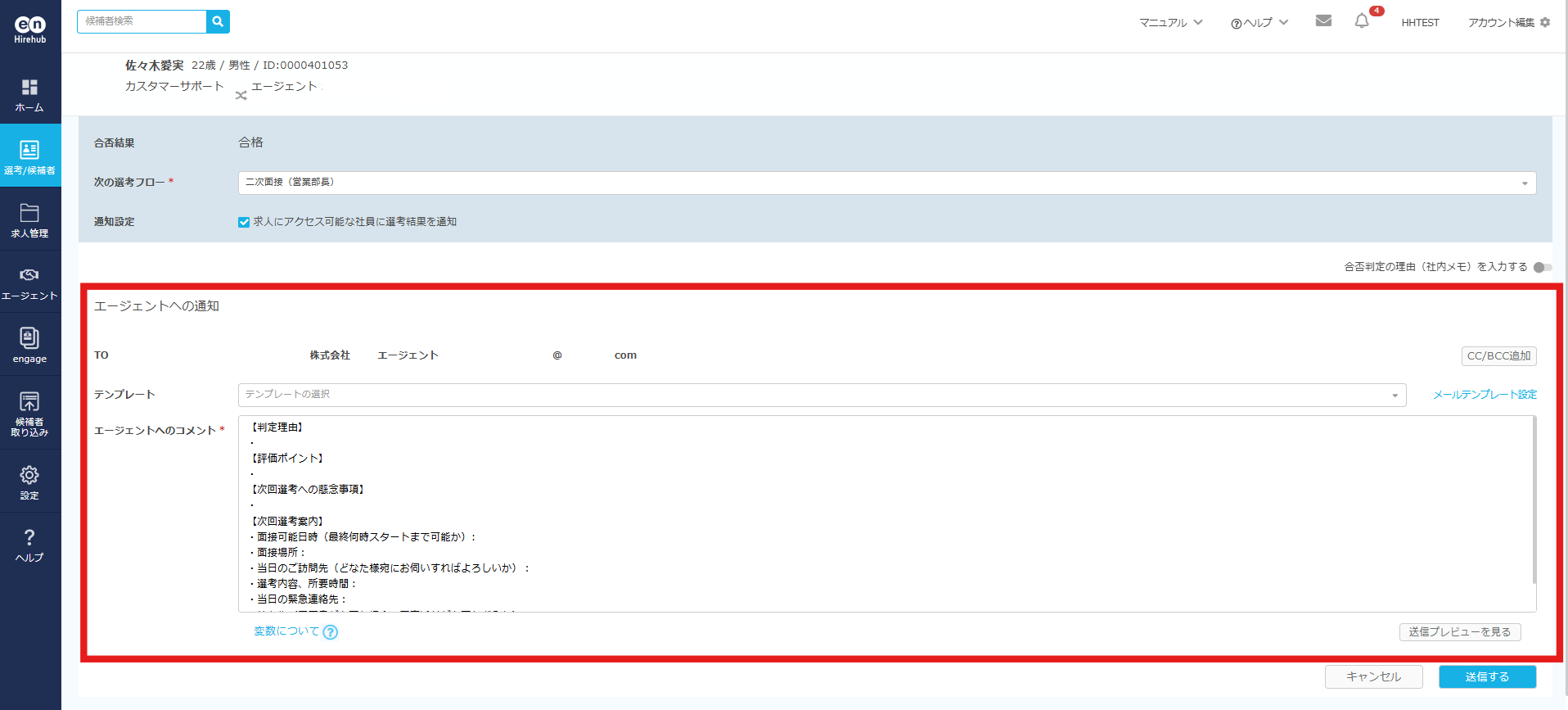 3.エージェントから推薦された候補者で選考判定をする場合は、エージェントへのコメントを入力し、「メール送信」をクリック。