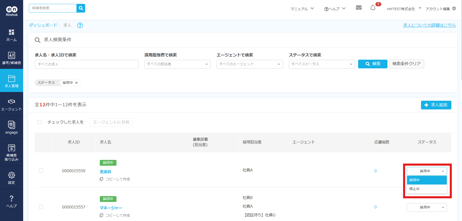 求人一覧画面でステータスを「停止中」に絞って検索してください