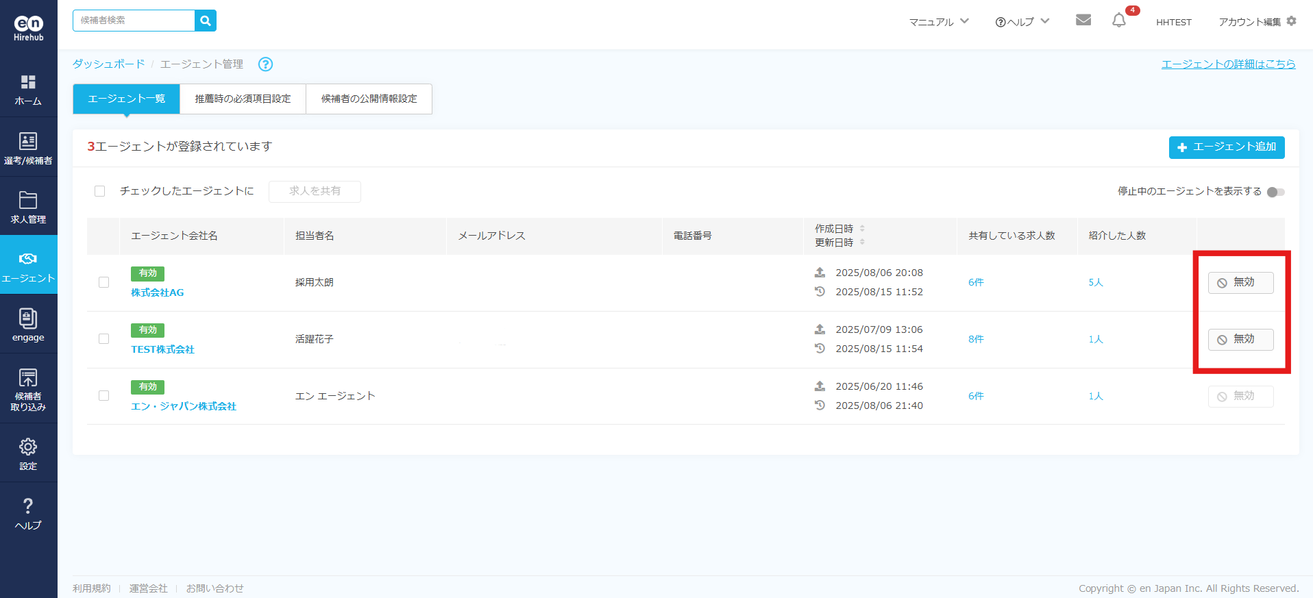 エージェントを削除したい Hirehubの仕様上、エージェントの削除はできません。以下の手順に沿って無効化の対応をお願いいたします。▼左側メニュー「エージェント」押下▼無効化したいエージェントの画面右側「無効」を押下