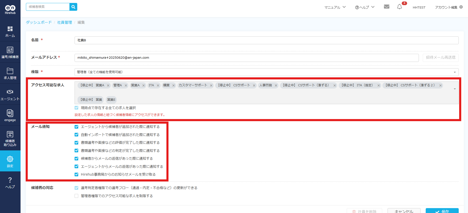 以下の通り操作いただき、社員アカウントの設定をご確認ください。