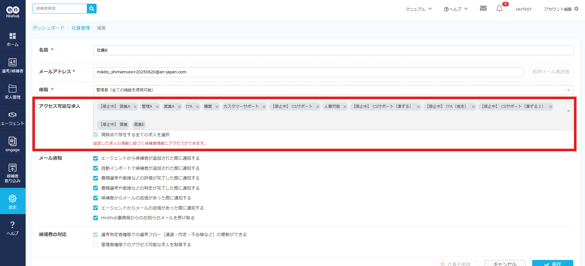 ▼候補者情報を見られない社員アカウントを選択