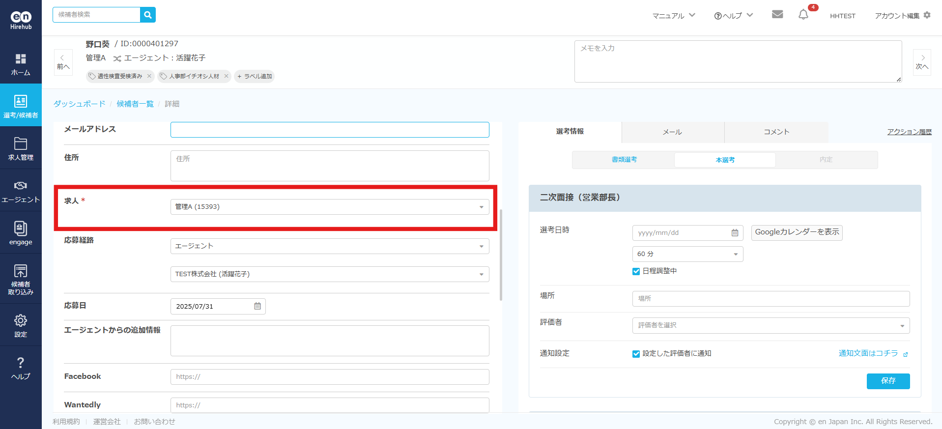 なおエン エージェントから推薦された候補者は求人変更ができません。