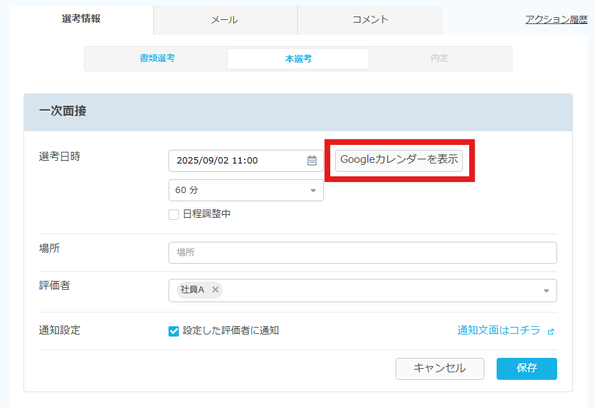 候補者詳細画面で本選考の日程を調整する際、Googleカレンダーを表示することは可能です。
