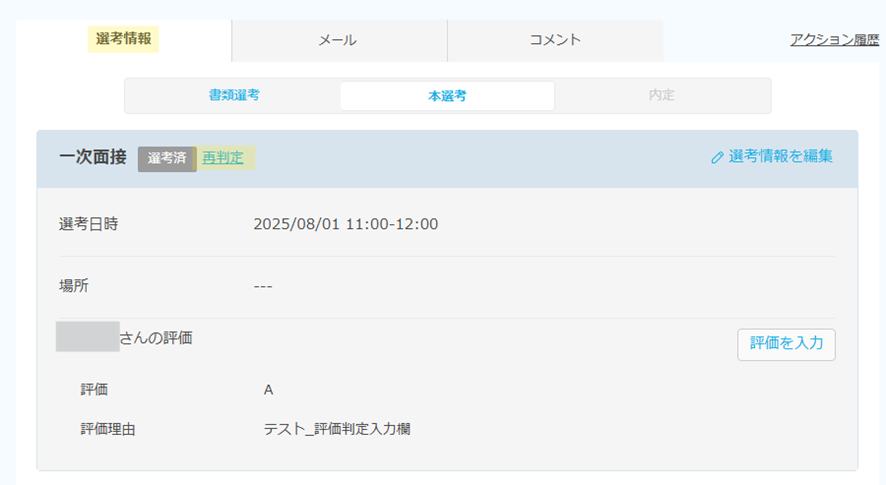 判定をやり直したい 以下の通り操作をお願いいたします。▼左側メニュー「選考/候補者」を押下▼判定をやり直したい候補者を選択▼画面右側「選考情報」タブを選択肢、判定をやり直したい選考フローで「再判定」を押下▼必要情報を入力し「選考を判定する」を押下