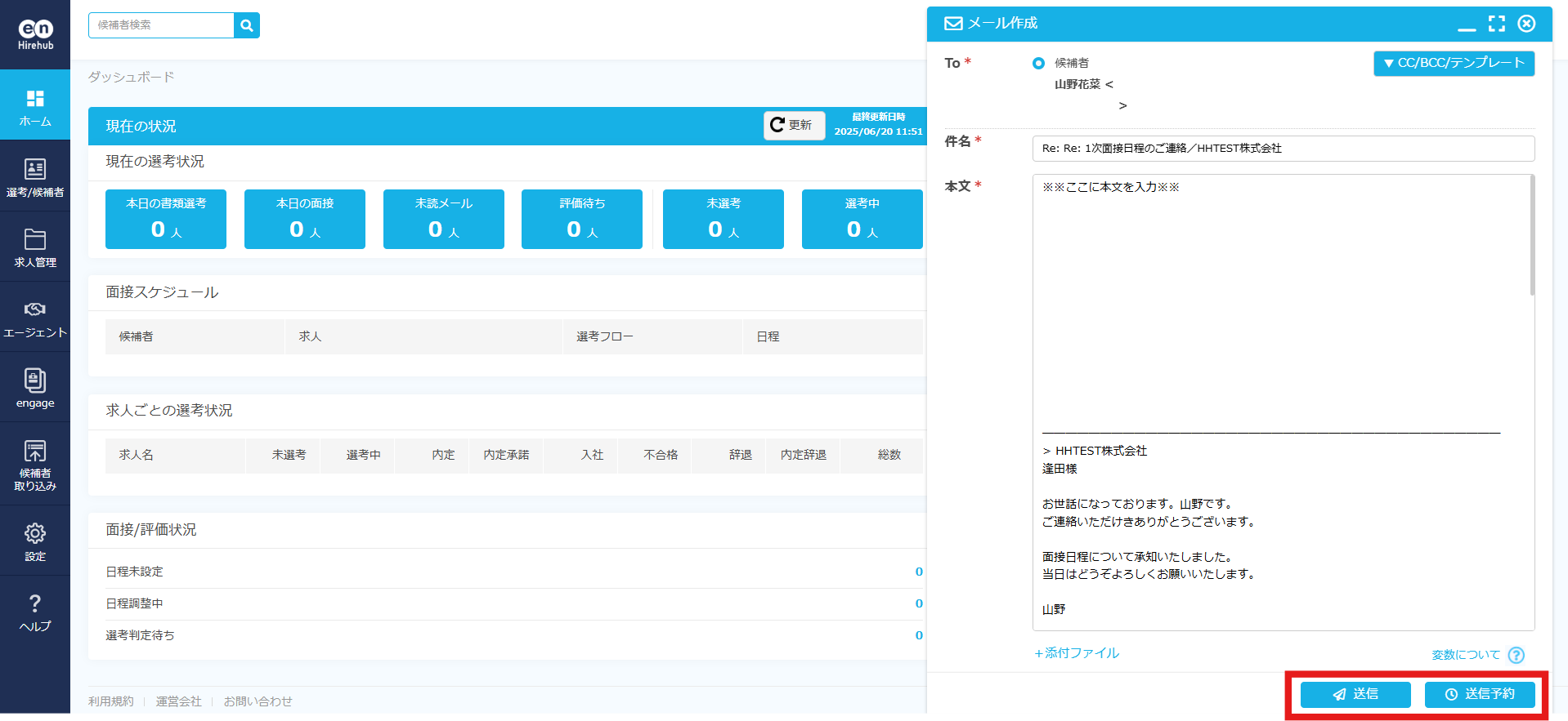 ▼必要事項を入力し、「送信」または「送信予約」を押下