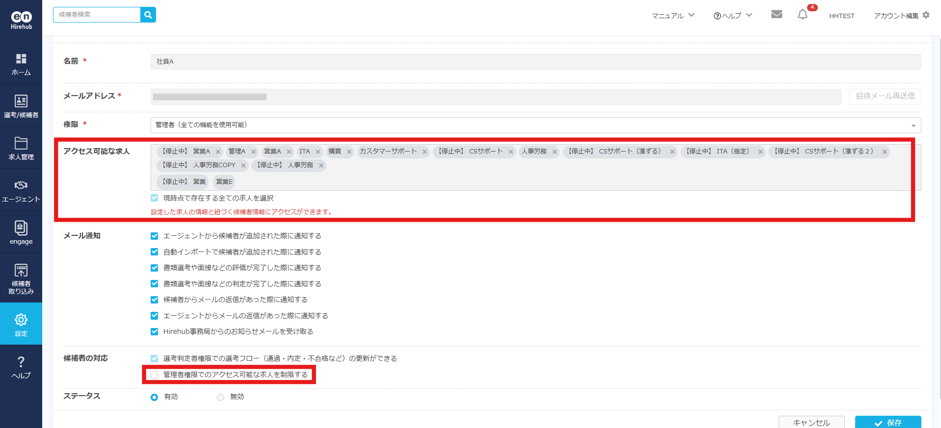 ※管理者権限の場合は、「管理者権限でのアクセス可能な求人を制限する」にチェックを入れてください