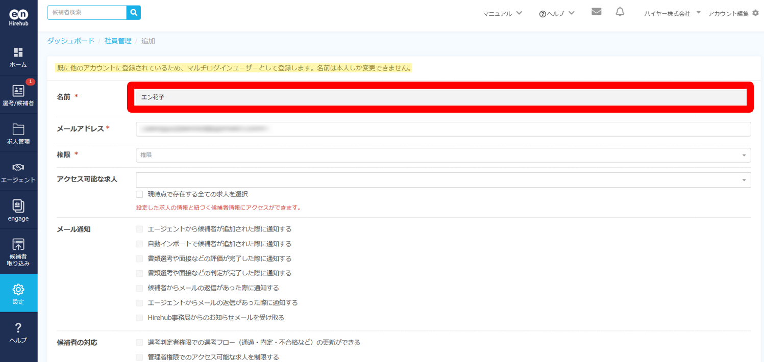 今回は、ハブ株式会社のエン花子さんを、ハイヤー株式会社にマルチログインする場合についてご紹介します。
