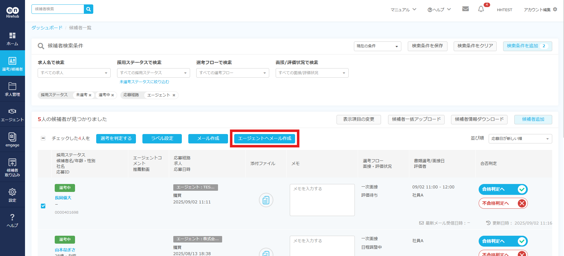 1. 候補者一覧画面から該当する候補者にチェックを入れ「エージェントへメール作成」のボタンをクリック。