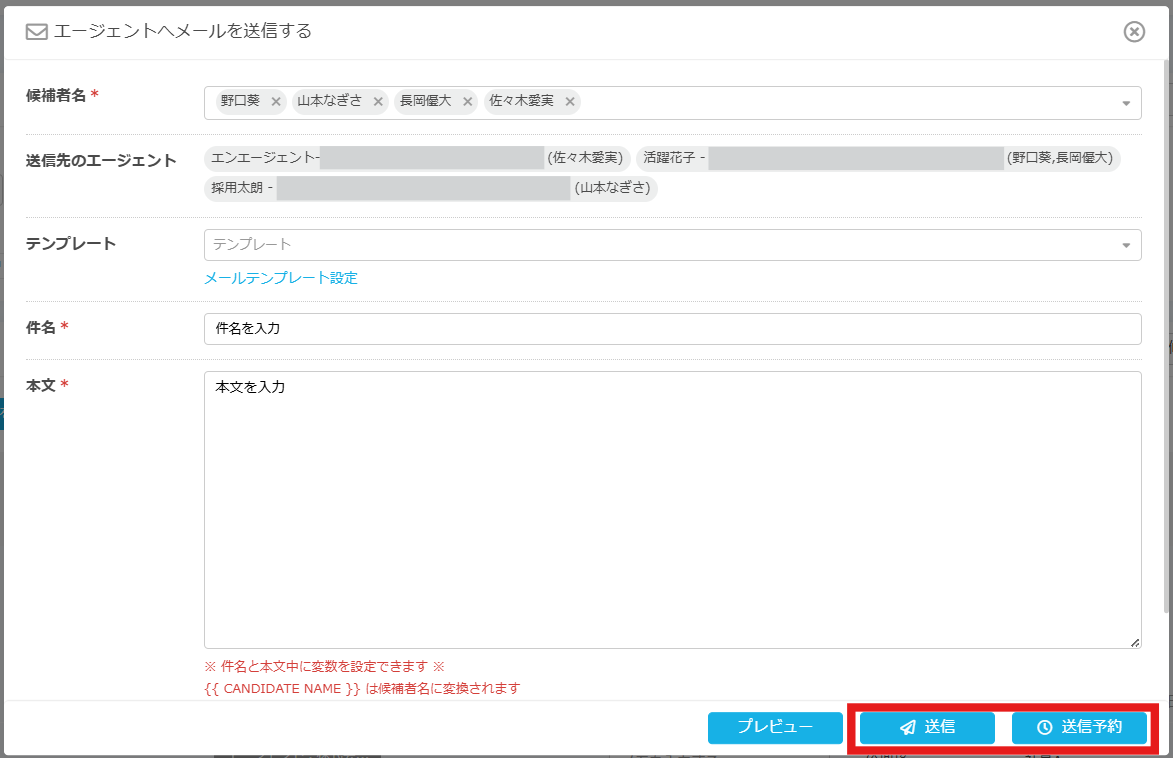 推薦された候補者についてのメールをエージェントに一斉送信することができます。